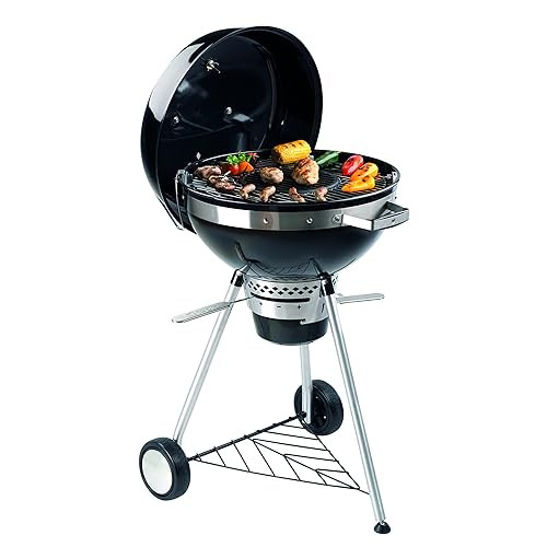 Stil: mit Ascheauffangbehälter | Größe: 60 x 66 x 102 cm Produktbeschreibung - Grillfläche: ca. 43,5 cm Ø - Feuerwanne ca. 49,5 cm Ø - 1 höhenverstellbarer verchromter Grillrost mit Grillrosteinsatz - emaillierter Deckel mit Kunststoffgriff - Thermometer - Lüftungsschieber im Deckel - emaillierte Feuerschale - integriertes Zubehörhalterungssystem (für z.B. Warmhalterost oder Deckelhalter) - inklusive Deckelhalter - 4 Holzkohlehalter für indirektes Grillen - Kohlerost - 2 abnehmbare Grillrostgriffe - integriertes Reinigungs- und Belüftungssystem - emaillierter Ascheauffangbehälter - 3 Standbeine - Frontbein mit Gelenkfuß - 2 Kunststoffräder mit Radkappen - pulverbeschichtetes Bodengitter - Arbeitshöhe ca. 77,5 cm - kohlefas-sungsvermögen max. 1 kg - Patent angemeldet - Design eingetragen Set enthält: 1