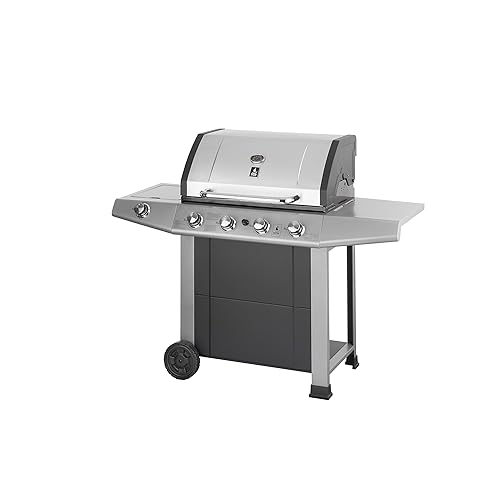 Leistung: 4 Brenner x 3,5 kW (14,0 kW) + Seitenbrenner 1 x 3,5 kW; Edelstahl Brenner; Brennverteiler emailliert; Grillrost emailliert; Warmhalterost verchromt; Fahrbar; Elektrische Piezozündung; Temperaturanzeige; Grillfläche: 73 x 43 cm; Feuerbehälter emailliert; Edelstahlhaube; Hauben - Seitenteile aus aluminiertem Stahl; Druckminderer und Gasschlauch