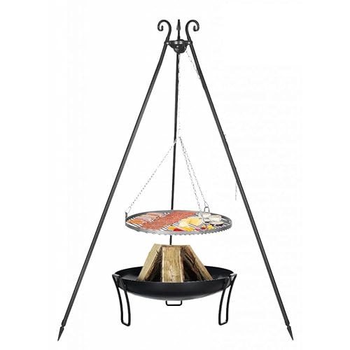 Schwenkgrill Dreibein Stahl 70cm inkl. Feuerschale 'Pan 39'80cm Hauptteil des Schwenkgrills auf dem Dreibein ist der runde Rost, der aus Rohstahl gefertigt wurde (erhältlich in drei Durchmessern). Je größer der Rost wird, desto mehr Platz hat man für Leckerbissen. Auf diesem kannst Du Wurst, Fleisch oder auch Gemüse grillen. Das Dreibein steht sicher und stürzt nicht um. Die spitzen Enden an den Beinen garantieren das auch auf unebenen Oberflächen. Die Kette hilft Dir die nötige Höhe zu regulieren. Auf der Terrasse am Haus oder während des Ausflugs ins Grüne - Du kannst den Grill überall benutzen. Auf der praktischen Feuerschale kannst Du das Feuer, wo Du willst, anzünden und das stabile Dreibein ohne Probleme auch auf die unebene Oberfläche stellen. Zu dem Set gehören: * der Rost (Durchmesser: 70cm) * die Kette * das Dreibein * die Feuerschale (Durchmesser: 80 cm) Wenn Sie mit Ihren Freunden und der Familie um einen Schwenkgrill herum sitzen, dann fühlen Sie sich vielleicht ein wenig wie am Lagerfeuer. Schließlich steht ein Lagerfeuer für Gemütlichkeit, Zusammenhalt und auch ein wenig für Romantik. Wenn abends alle um die Feuerstelle herum sitzen, dabei ein paar kühle Getränke genießen und dem Fleisch beim Garwerden zuschauen, dann ist gute Laune beinahe garantiert. Alle Produkte der Firma Farmcook zeichnen sich durch ein ansprechendes Design aus. Sie sind sicher und stabil konstruiert und durch Ihre Materialien hochwertig und langlebig. Dank der speziellen Konstruktion des Dreibeins können die Farmcook-Produkte an jedem beliebigen Ort und auf jedem Untergrund aufgestellt werden. Leichte Montage macht das Reinigen kinderleicht. Alle Farmcook-Produkte sind auf Ihre Lebensmitteltauglichkeit zertifiziert.